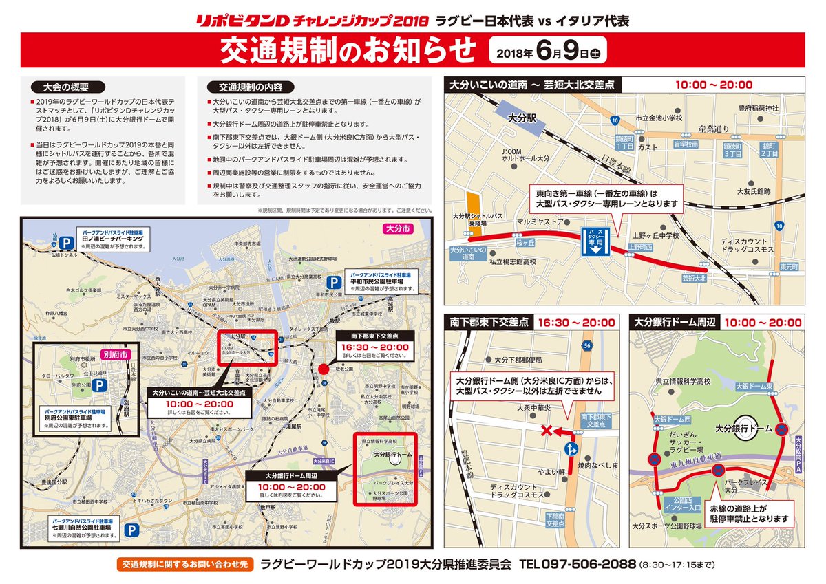 大分県警察 On Twitter 交通規制のお知らせ ラグビー日本代表戦開催に伴う交通規制 10 23 13 45キックオフ の開催に伴い 昭和電工ドーム周辺や南下郡東下交差点において交通規制を行います 当日は 混雑が予想されます 外出の際は交通規制のご確認をお願い